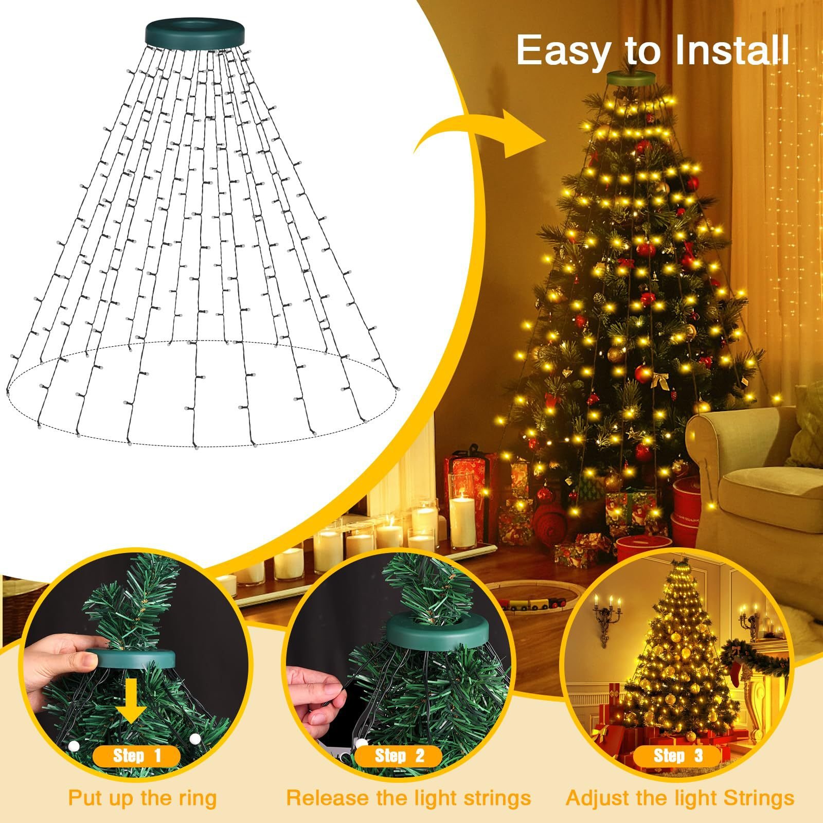 No tools needed—just place the halo ring at the top of your tree, let the light strands cascade down, and you’re done! Decorating has never been this simple.